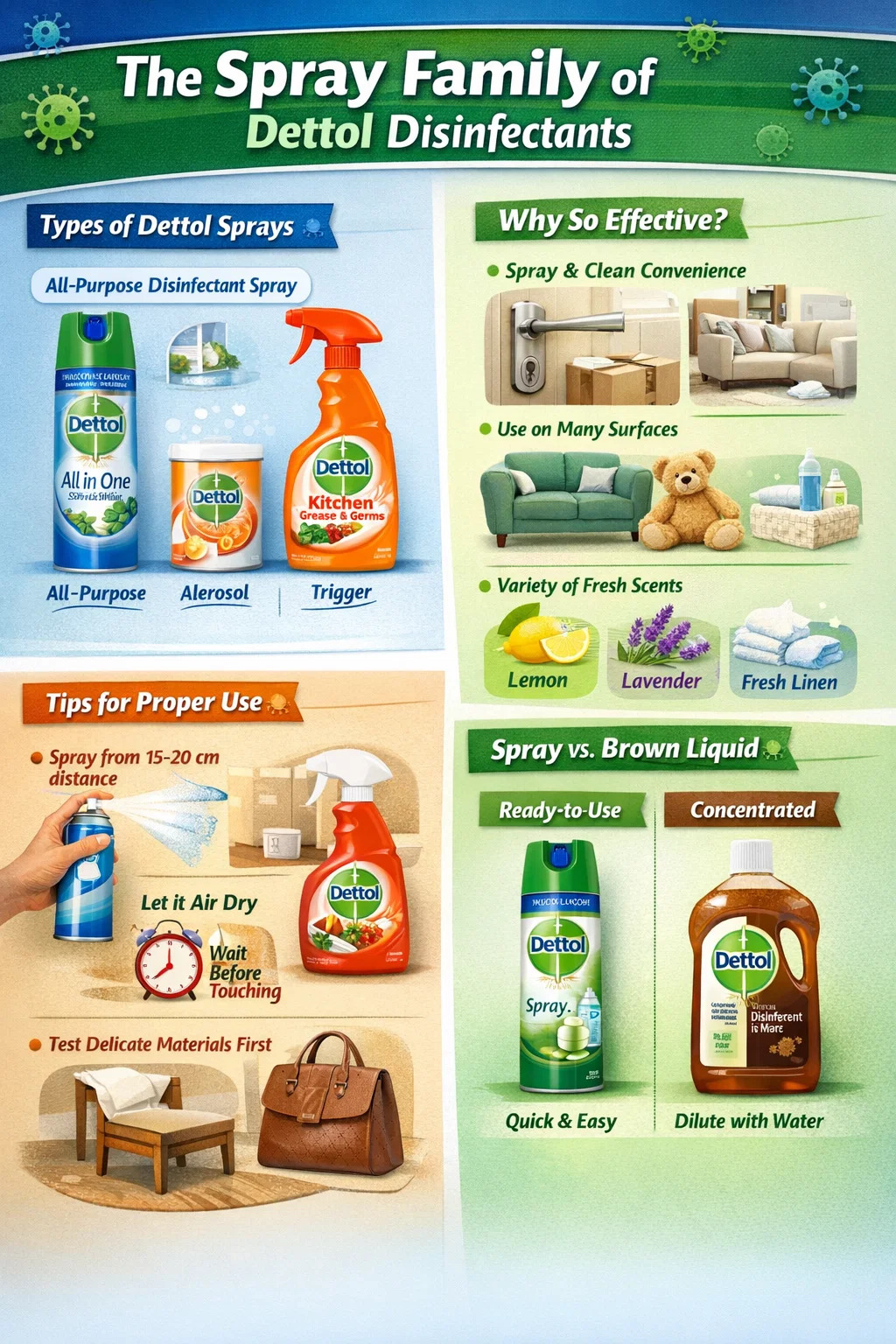เดทตอลมีผลิตภัณฑ์สเปรย์ฆ่าเชื้อหลายชนิดจริงๆ แม้ว่าคนส่วนใหญ่จะคุ้นเคยกับน้ำยาฆ่าเชื้อสีน้ำตาล แต่จริงๆ แล้ว Dettol มี "ตระกูลสเปรย์" ทั้งหมด